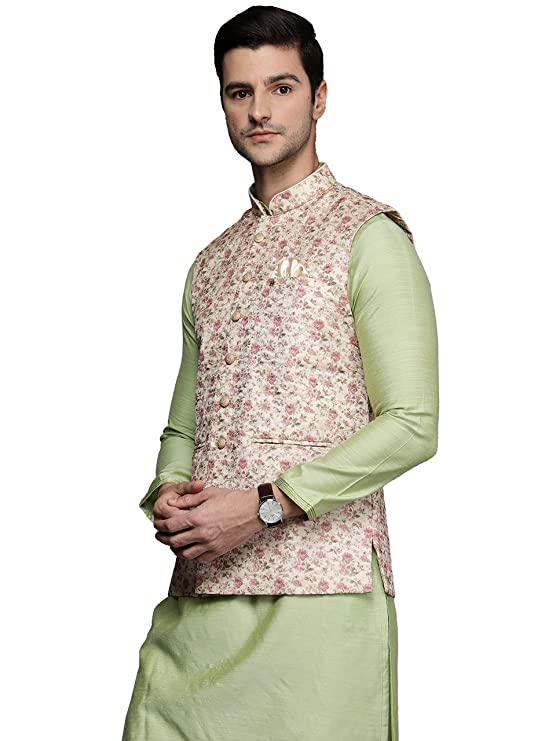 Description Featuring delicate floral motifs on a sublime art silk base, this light colored floral work jacket is an exceptional piece that deserves a special place in your wardrobe. Shop now! Additional Information ManufacturerManyavar, Vedant Fashions Limited. Paridhan Garment Park, SDF Building, Block A, Kolkata 700015. PackerManyavar Creations Pvt Ltd, Srijan Industrial Logistic Park, Part-C, Block-A, 1st Floor, NH-6, Howrah-711302 Item Weight450 g Item Dimensions LxWxH33 x 23 x 4 Centimeters Net Quantity1.00 count Generic NameMen s Nehru Jacket